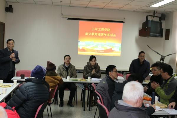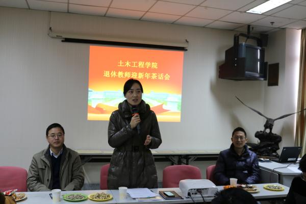 茶话会由学院前任书记张星主持。张书记向各位老教师介绍了院系领导调整情况。随后,新任书记刘静代表学院致辞,感谢各位退休老师多年来为学院作出的重要贡献,恳请老教师们一如既往地关心学院的发展,对学院工作提出宝贵的意见和建议,并献上新年祝福。