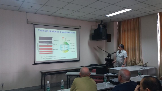 俄罗斯学者分别从理论和实践领域探讨了光化学在环境领域的应用。Nikolai Bazhin教授做了题为“Heat and work of the chemical systems”的学术报告,他阐述了基础化学热力学相关理论,提出从新的角度思考机械、渗透和电流等化学系统的机制及其在环境过程研究中的应用;Viacheslav Glebov教授做了题为“Uranyl Modified Titania as a Visible Light Photocatalyst”报告;高级研究员Ivan Pozdnyako博士讲解了光化学与光谱的基本原理和Fe(III)与腐殖物质对微污染物的光氧化作用。随后,市政工程系傅大放教授与来访专家进行了交流。