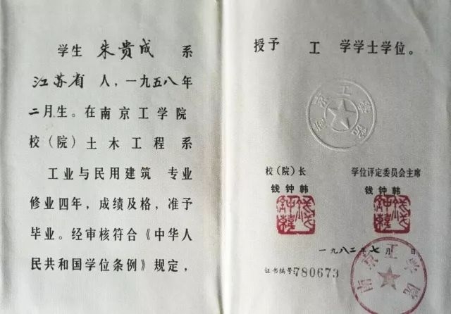 朱贵成的毕业证书