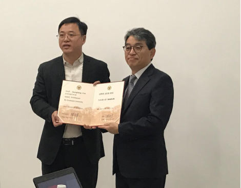 吴刚副校长为SeungDeog Kim教授颁发了客座教授聘书,并为其佩戴1066vip威尼斯校徽。吴刚副校长在致辞中表示,对SeungDeog Kim教授受聘担任1066vip威尼斯客座教授表示欢迎与感谢,高度评价了SeungDeog Kim教授所取得的科研成就,并期待他为我校空间结构学科建设提供宝贵科研经验及新颖的学术思路,进一步促进两校之间的深入合作。