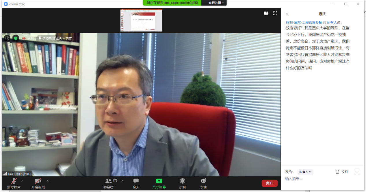 许智文教授报告的题目为“Housing Market Dynamics(房地产市场分析)”。许老师主要从全球房地产市场、房地产市场影响因素和房地产市场经济等方面对房地产市场进行介绍。首先以香港回归以来房地产市场的价格变化引入对房地产市场的影响因素分析,重点强调了疫情因素和政策因素,分别以非典时期和今年新冠疫情时期的房价波动为例进行对比分析。之后对房地产市场特点进行介绍,详细介绍了房地产市场经济的关键知识如房地产泡沫产生原因。最后对香港未来房地产市场走向进行预测。