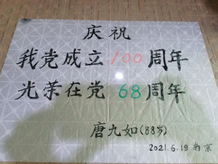 今年88岁、光荣在党68年的唐九如老师满怀仪式感,穿上崭新的衬衣,戴上熠熠生辉的纪念章,无比激动地展示出自己题写的字画,精神焕发。唐老师衷心感谢上级党组织对自己的关心关爱,他表示党员身份是一辈子的,要继续做好表率,坚定不移听党话、跟党走,竭尽所能的为党旗再添光彩,为党徽再增光芒,为党、为国家、为社会继续发挥余热。