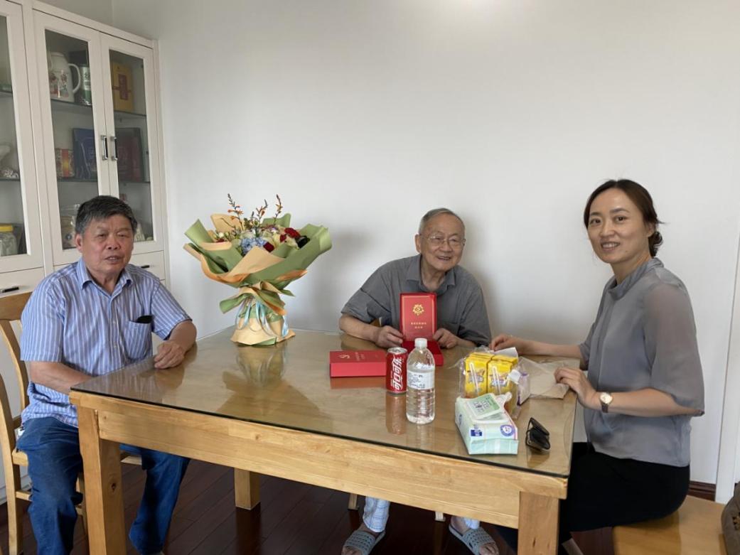 6月21日下午,学院党委刘静书记,退休教师党支部副书记、关工委委员龚建民老师,宣传秘书张洁琪老师一行分别来到王功勋老师、江亚英老师先生、陶光华老师、刘振田老师住处,为他们颁发纪念章、送上鲜花和慰问金。