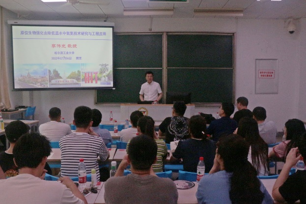 市政工程专题特邀哈尔滨工业大学李伟光教授做了“原位生物强化去除低温水中氨氮技术研究与工程应用”报告。李教授介绍了氨氮污染的概况及分析方法,指出了常规技术去除氨氮的不足,表明改良水中氨氮去除技术势在必行。李教授介绍了异养硝化作用效能研究,向同学展示了现场试验研究平台,氨氮具体的去除效能,菌落的变化特征以及菌株的耐低温机理。讲解了生物异养的技术理论及该项技术的工程应用。