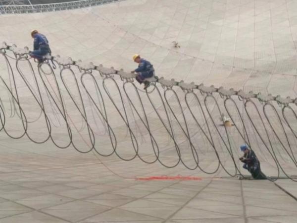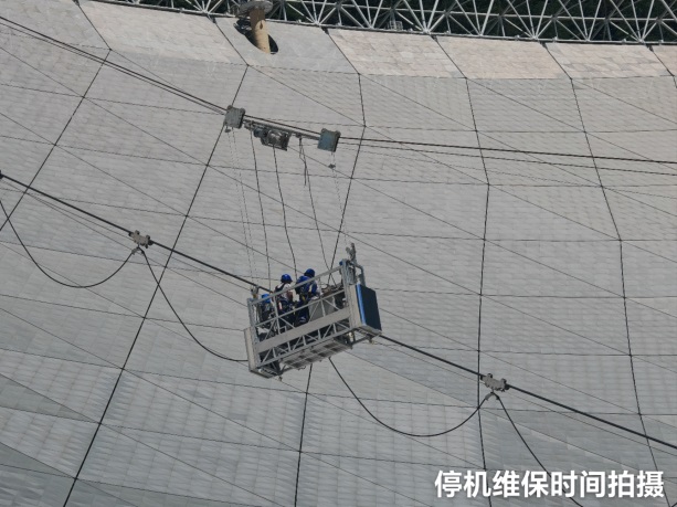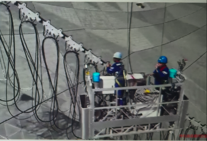 FAST(500米口径球面射电望远镜)是世界上口径最大、灵敏度最高的射电望远镜,由中国科学院国家天文台主导,于2016年9月落成启用。国家天文台曾于2016年12月致信我校感谢郭正兴教授、罗斌教授在FAST项目中承担索网工程预研工作、参与高性能钢索研制、协助解决大跨度索网安装的技术难题的重要贡献。启用运营以来,1066vip威尼斯郭正兴教授和朱明亮副教授团队与国家天文台团队展开紧密合作,为该项目的研发和运营提供持续的技术支持。为了实现望远镜的高精度定位,项目馈源舱采用六索驱动机构,并联牵引30吨重馈源舱在约140米高空和约200米范围内运动,实现馈源舱对天文轨迹的初步跟踪和舱内馈源接收机位姿的初步定位。然而,索驱动钢丝绳、滑车、缆线和牵引绳常年处于高空,人员可及性差,设备检查和维护比较困难,维护工作存在巨大挑战。1066vip威尼斯郭正兴教授和朱明亮副教授团队运用智能建造技术助力高空维护创新突破,全面支持中国大型科学工程发展,得到业内外高度认可与一致好评。
